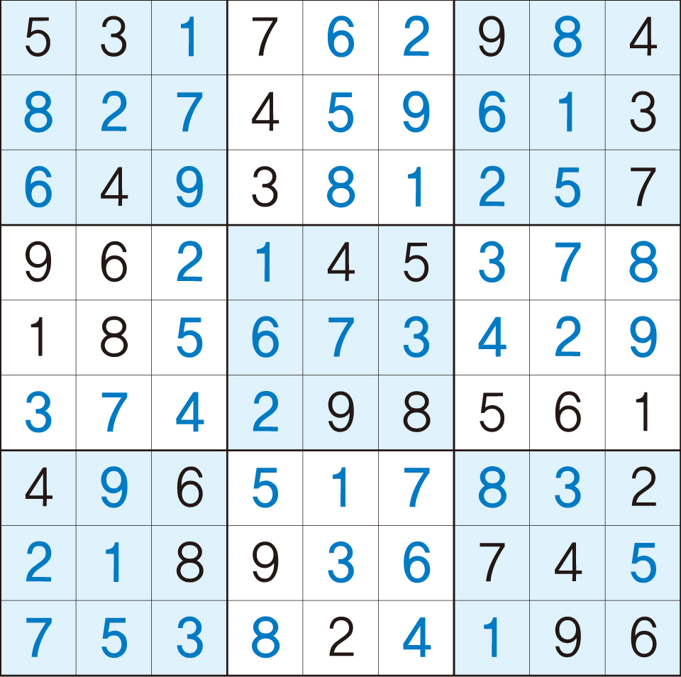 3. 큰 정사각형(9x9) 안에 있는 작은 정사각형(3x3) 안에는 숫자 1~9가 각 한 번씩 들어간다.
