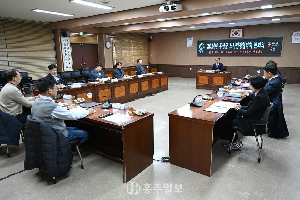 홍성군 노사민정협의회(위원장 이용록)는 지난 11일 군청 회의실에서 ‘2024년 홍성군 노사민정협의회 본회의’를 개최했다.<사진>