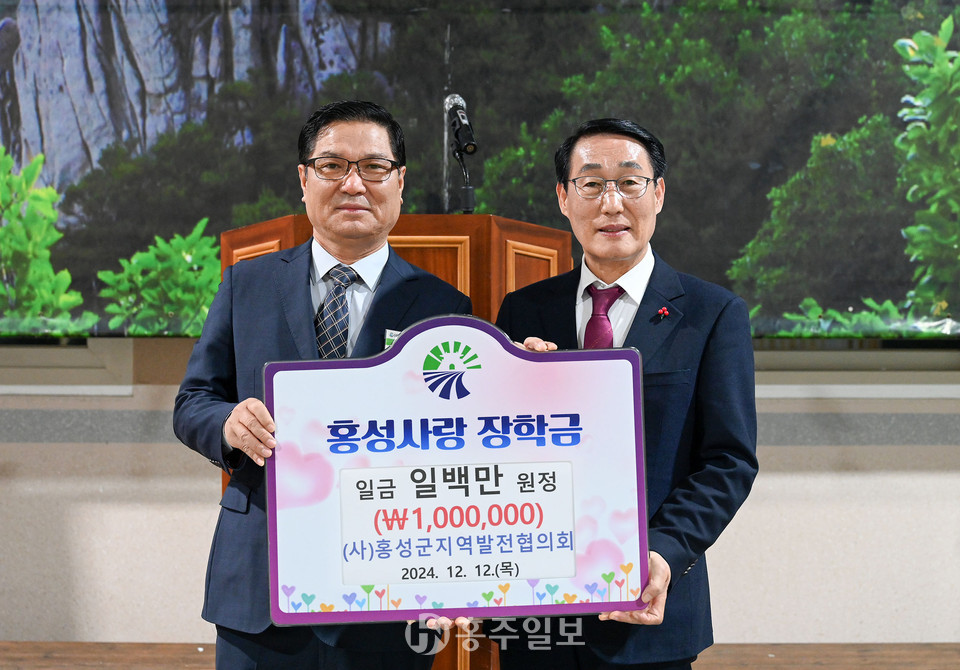 홍성군지역발전협의회가 지난 12일 홍성군의 우수 인재 양성을 위해 홍성사랑장학금 100만 원을 홍성군에 기탁했다.<사진>