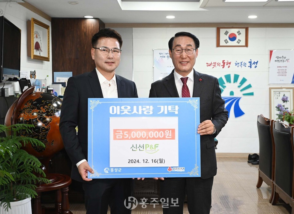 농업회사법인 신선P&F(대표 유형진)가 오늘(16일) 홍성군에 이웃사랑 성금 500만 원을 기탁했다.<사진>