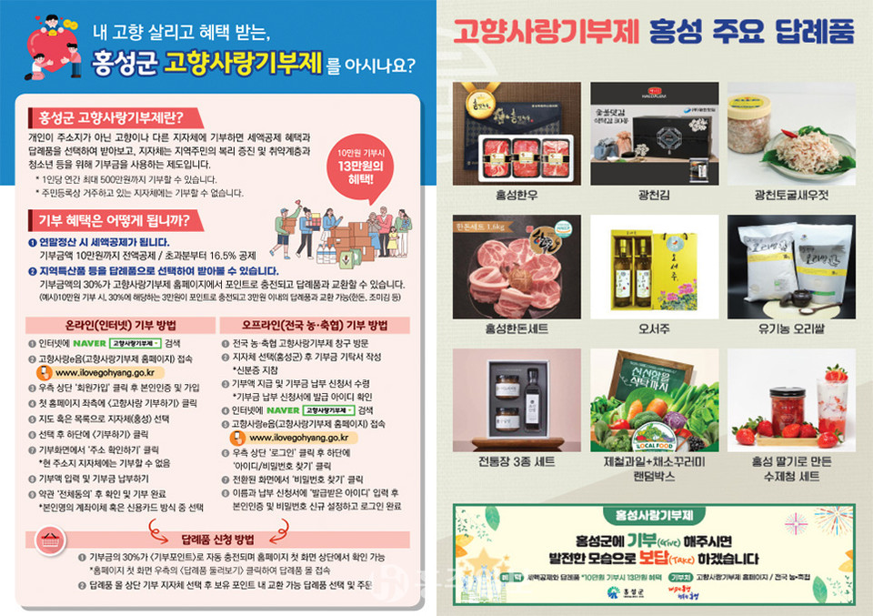 한편 2023년부터 시행된 고향사랑기부제는 주민등록상 거주지를 제외한 지역에 1인당 연간 500만 원까지 기부할 수 있으며, 기부금의 30%를 고향사랑e음 포인트로 환급받아 해당 지역의 답례품을 선택할 수 있는 제도이다. 홍성군은 앞으로도 기부자들의 기대에 부응하는 다양한 답례품 개발과 효율적인 기부금 활용을 통해 제도의 안정적인 정착에 기여할 계획이다.
