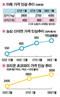 대표적인 서민 먹거리인 자장면의 경우 올 들어 상당수 중식당이 가격을 3,000∼3,500원에서 3,500∼4,000원으로 올렸다. 한편 군내 유통업체들에 따르면 채소 값도 오름세다. 비닐하우스 등 온실에서 재배될 경우 난방비가 많이 들어 유류 인상의 직격탄을 맞는다는 설명이다.