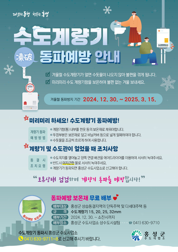 홍성군이 동절기 기간 수도계량기 동파 예방을 위해 이달부터 오는 3월까지 종합대책을 마련하고, 군민의 불편을 최소화하겠다고 밝혔다.