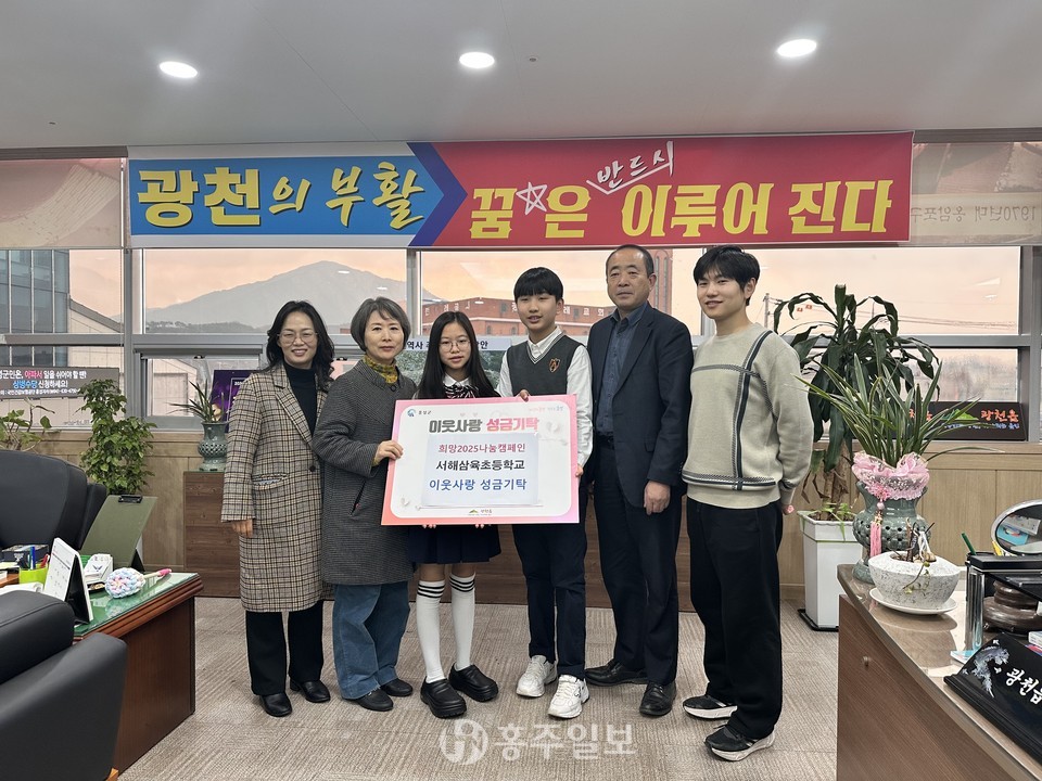 정동규 광천읍장은 “서해삼육초등학교 학생들의 자발적인 나눔 실천이 지역사회에 큰 희망이 되고 있다”며 “어린 학생들이 나눔을 통해 행복을 배우고 바른 인성을 기르는 모습이 우리 지역의 미래를 더욱 밝게 만들고 있다”고 말했다.