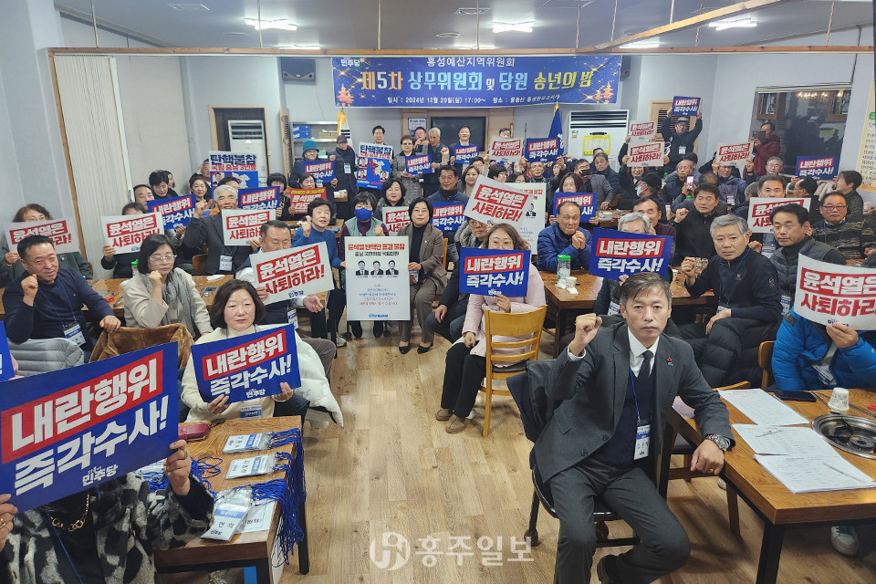 [홍주일보 홍성=오동연 기자] 더불어민주당 홍성예산지역위원회(위원장 양승조)는 지난달 29일 용봉산 인근 한우프라자에서 ‘윤석열 파면 강승규 사퇴 결의대회’와 함께 당원 송년회를 개최했다.