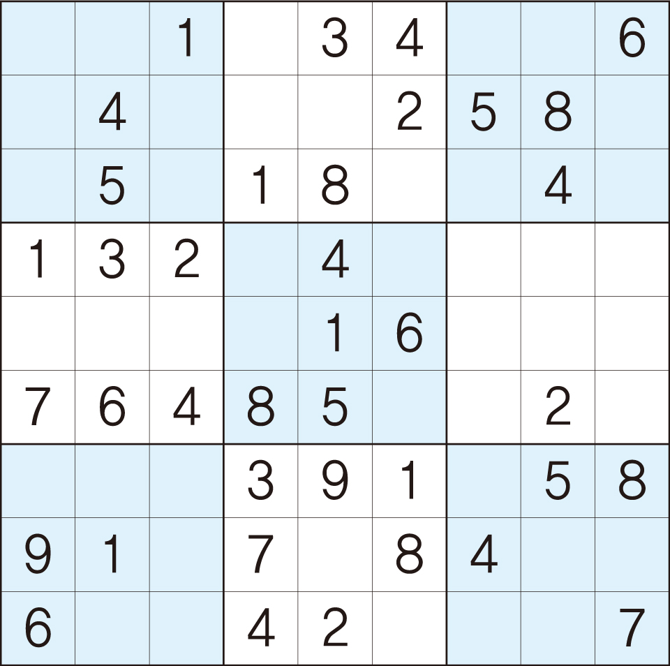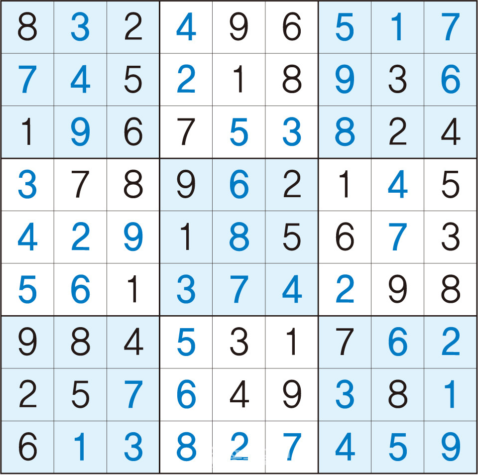 3. 큰 정사각형(9x9) 안에 있는 작은 정사각형(3x3) 안에는 숫자 1~9가 각 한 번씩 들어간다.