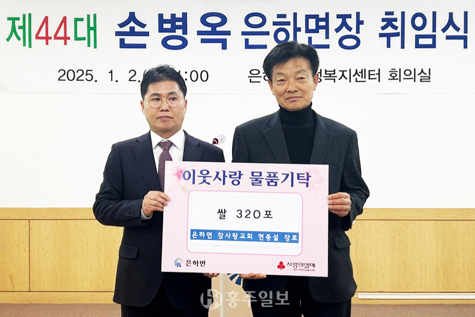 은하면행정복지센터는 지난 2일 오전 11시, 희망 2025 나눔 캠페인 현물 기탁식 행사를 추진해 현종설 장로에게 감사의 마음을 전달했고, 기탁받은 쌀 320포는 결식이 우려되는 은하면의 저소득층·취약계층과 지역 주민들에게 전달될 예정이다.