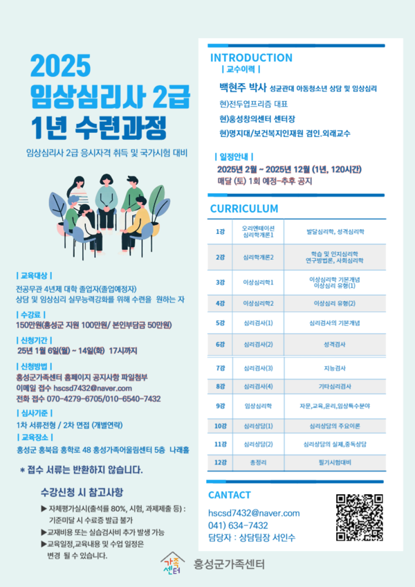 교육과정은 오는 2월부터 12월까지 총 12회기로 매월 셋째주 토요일에 운영할 예정이며, 교육 수료자는 임상심리사 2급(국가자격증) 취득 응시자격인 수료증을 받게 된다.