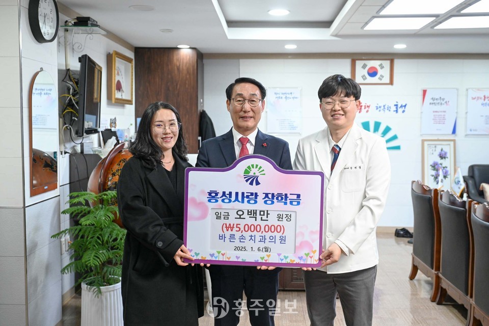 홍성군은 지난 6일 바른손치과의원(원장 임재형)이 (재)홍성사랑장학회에 지역인재 육성을 위한 장학금 500만 원을 기탁했다고 밝혔다.<사진>