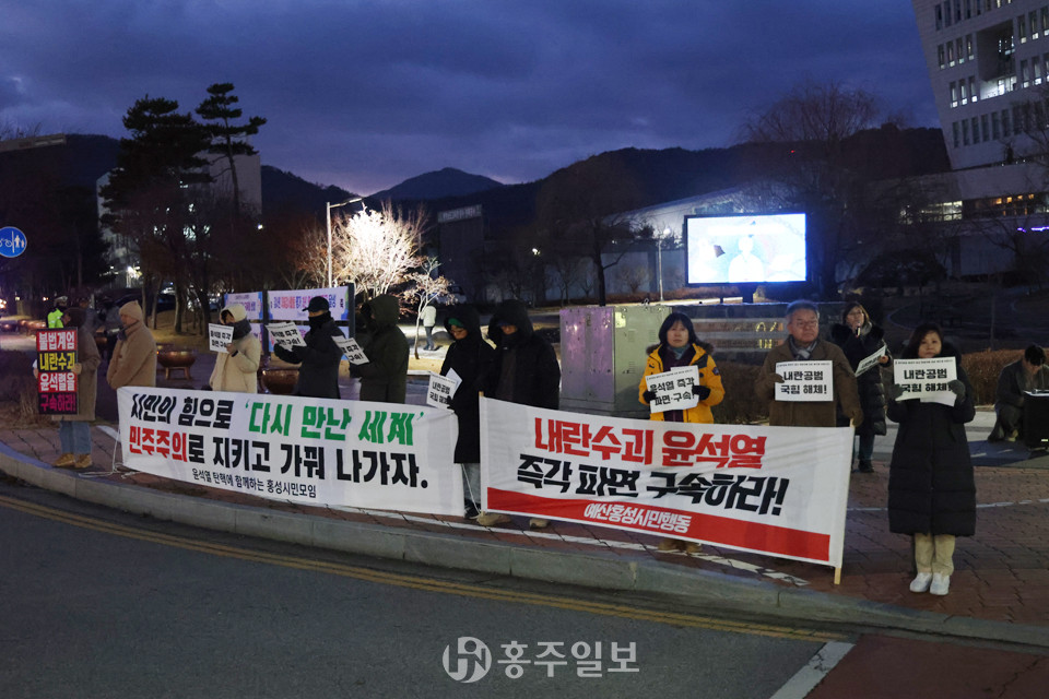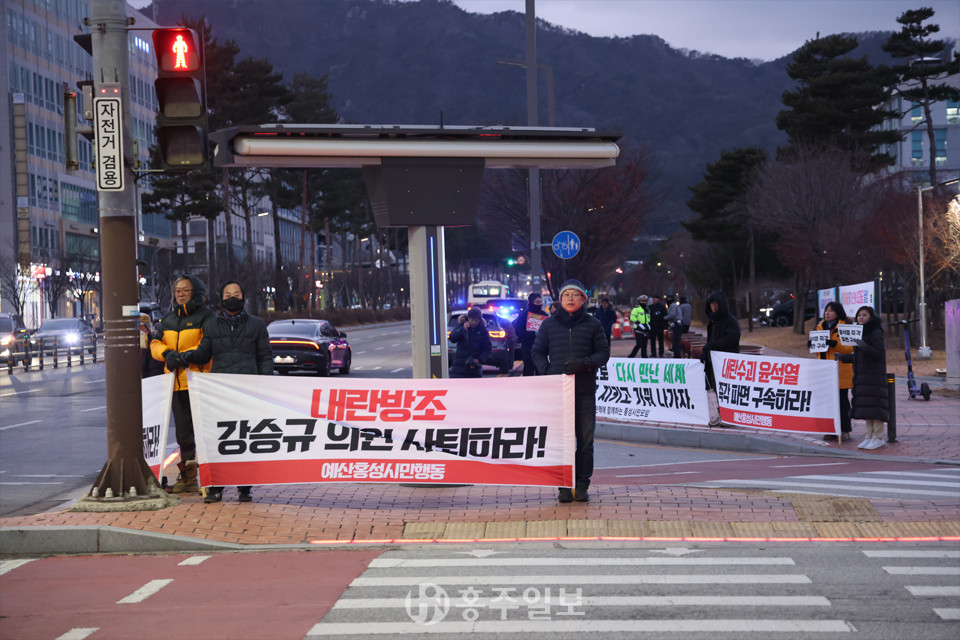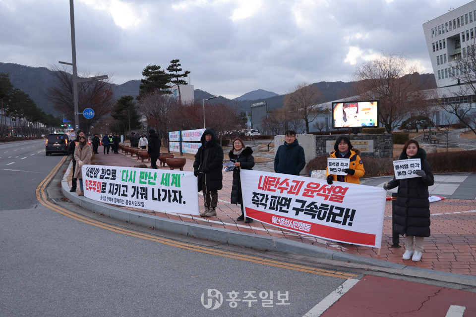 추운 날씨와 매서운 바람에도 한 목소리를 내기 위해 모인 홍성군의회 최선경 의원, 정의당 충남도당 유미경 사무처장 등 30여 명의 예산·홍성 시민들은 충남교육청 사거리 교차로에서 △내란방조 강승규 의원 사퇴하라 △내란동조 국민의 힘 해체하라 △내란수괴 윤석열 즉각 파면 구속하라 △시민의 힘으로 ‘다시 만난 세계’ 민주주의로 지키고 가꿔 나가자 등의 현수막과 피켓을 들고 한목소리를 냈으며 퇴근길 시민들도 함께할 것을 호소했다.