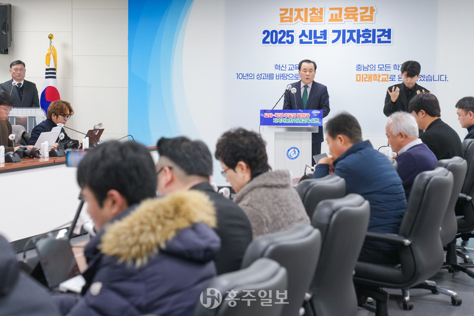 [홍주일보 이정은 수습기자] 김지철 충남교육감은 9일 도교육청 1회의실에서 2025 신년기자회견을 열고 ‘지난 1년간의 성과와 올해 12대 중점 추진 과제’를 발표했다.<사진>