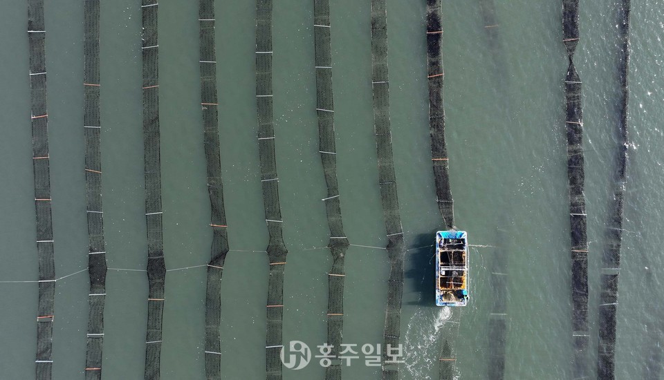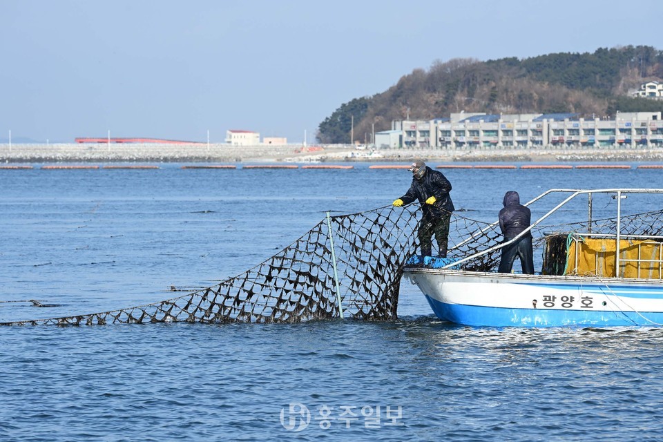 이번 겨울 가장 추운 날씨를 기록한 지난 10일, 서부면 남당항 김 양식장에서는 추위에 아랑곳하지 않고 어부들이 김 수확에 한창이다. 홍성군 김 양식장은 총 100ha 규모로 지난해 대비 10배 증가했으며, 어민들은 오는 5월까지 원초를 수확할 예정이다.(사진=홍성군)