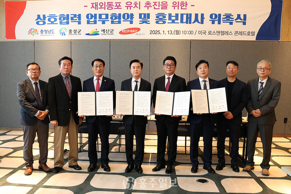 외자유치 등을 위해 미국 출장 중인 김태흠 충남지사는 지난 13일(현지시각) 콘레드LA호텔에서 캐빈백 미국 레드포인트그룹 CEO, 이용록 홍성군수, 최재구 예산군수와 ‘지역 활성화 융복합 프로젝트’(재외동포 유치) 추진 상호 협력 업무협약을 체결했다.