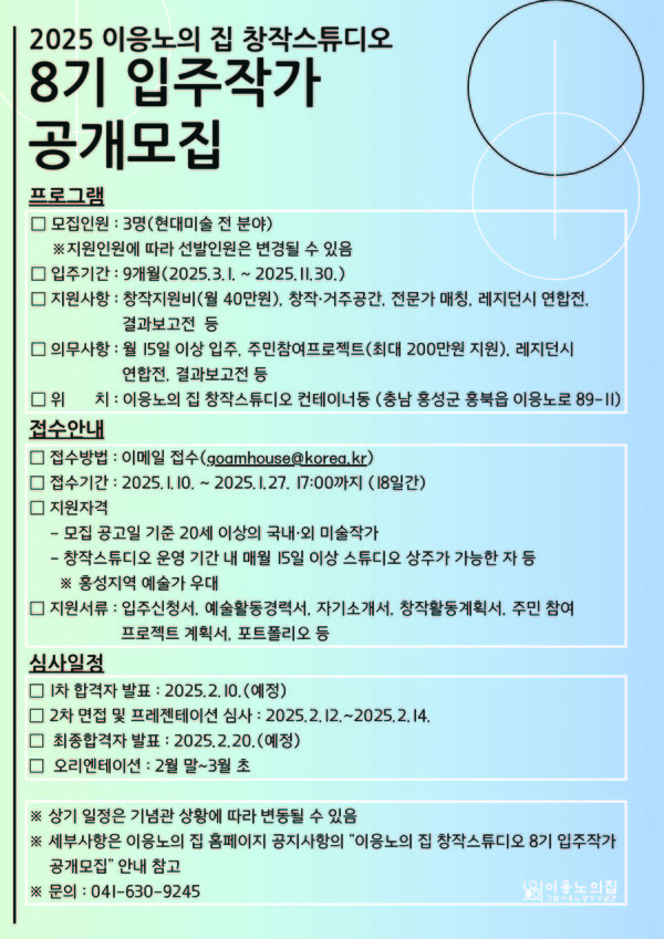 올해 8기 입주작가 공개모집에서는 모집 공고일 기준 20세 이상의 국내·외 미술작가 중 입주 기간 내 매월 15일 이상 창작스튜디오에 상주가 가능한 현대미술 전 분야의 미술작가 3명을 모집할 예정이다.
