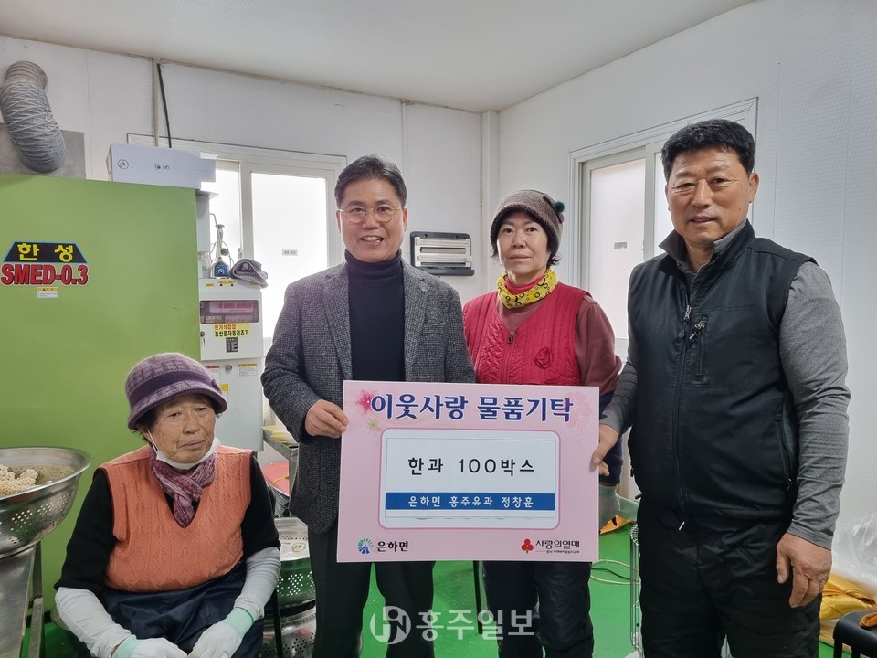 은하면행정복지센터는 지난 14일 희망2025 나눔캠페인 현물기탁식 행사를 추진해 ㈜홍주유과에 감사의 마음을 전달했고, 기탁받은 한과 100박스는 은하면의 저소득층·취약계층 가구 등에 전달될 예정이다.