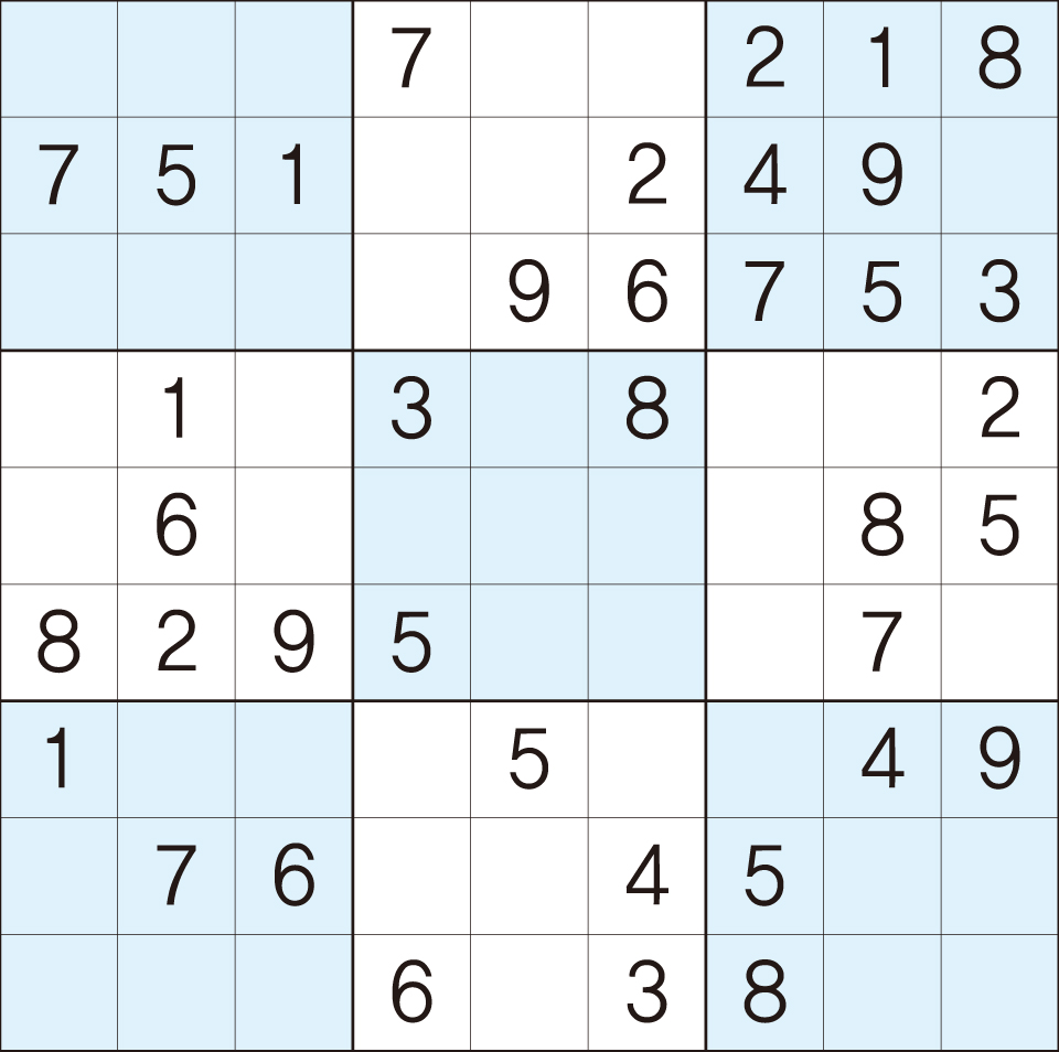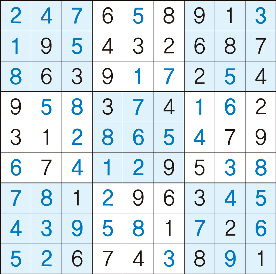 3. 큰 정사각형(9x9) 안에 있는 작은 정사각형(3x3) 안에는 숫자 1~9가 각 한 번씩 들어간다.