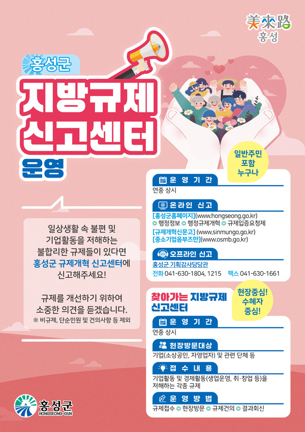 또한 군은 “올해부터 군민들이 일상 속 또는 경제활동 중 불편했던 규제 사항을 보다 쉽게 건의할 수 있도록 읍·면 행정복지센터, 사업소 등 내에도 ‘홍성군 지방규제신고센터’ 창구를 상시 운영할 계획”임을 밝혔다.