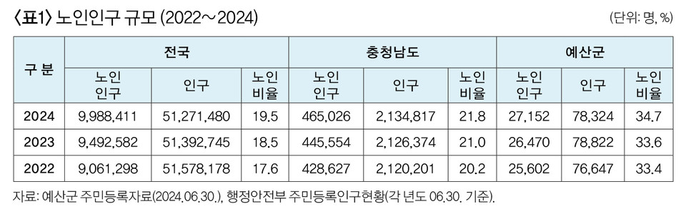 예산군이 ‘2024 예산군 노인복지통계 보고서’를 발간했다. 이 보고서는 2024년 6월 30일 기준 65세 이상 노인 인구를 대상으로 작성됐으며 인구, 경제, 고용, 복지, 연금, 건강 6개 부문 105개 지표를 주민등록, 장애인등록, 기초수급, 재산세 자료와 통계청 건강보험공단, 군민연금공단 등 각 기관의 자료를 활용했다.