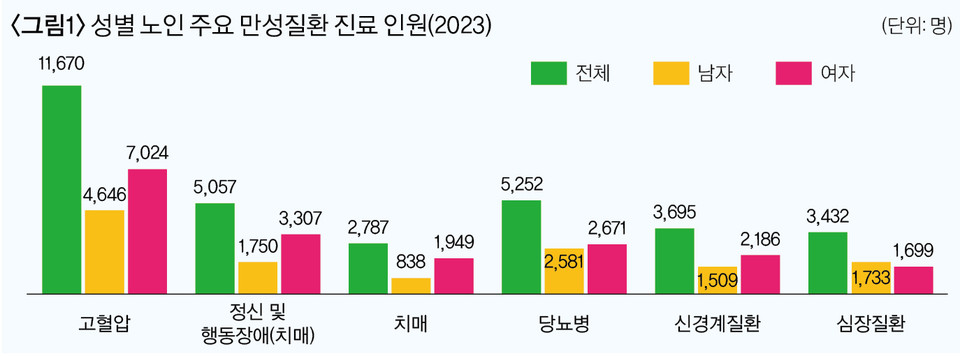 노인 요양급여(건강보험 급여실적, 의료급여 및 비급여는 제외) 진료비는 총 1조 2108억 원으로 입원이 5047억 원(41.7%), 외래가 4432억 원(36.6%), 약국이 2627억 원(21.7%) 순이다. 노인 주요 만성질환 진료 원인은 △고혈압 1만 1670명 △당뇨병 5252명 △정신 및 행동장애(치매 등) 5057명 △신경계질환 3695명 △심장질환 3432명 순이고, 주요 만성질환의 1인당 진료비는 심장질환이 242만 7000원으로 가장 비쌌으며 정신 및 행동장애 151만 1000원, 신경계질환이 102만 1000원으로 나타났다.