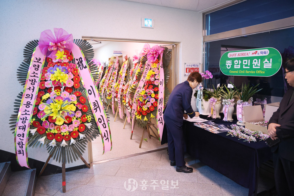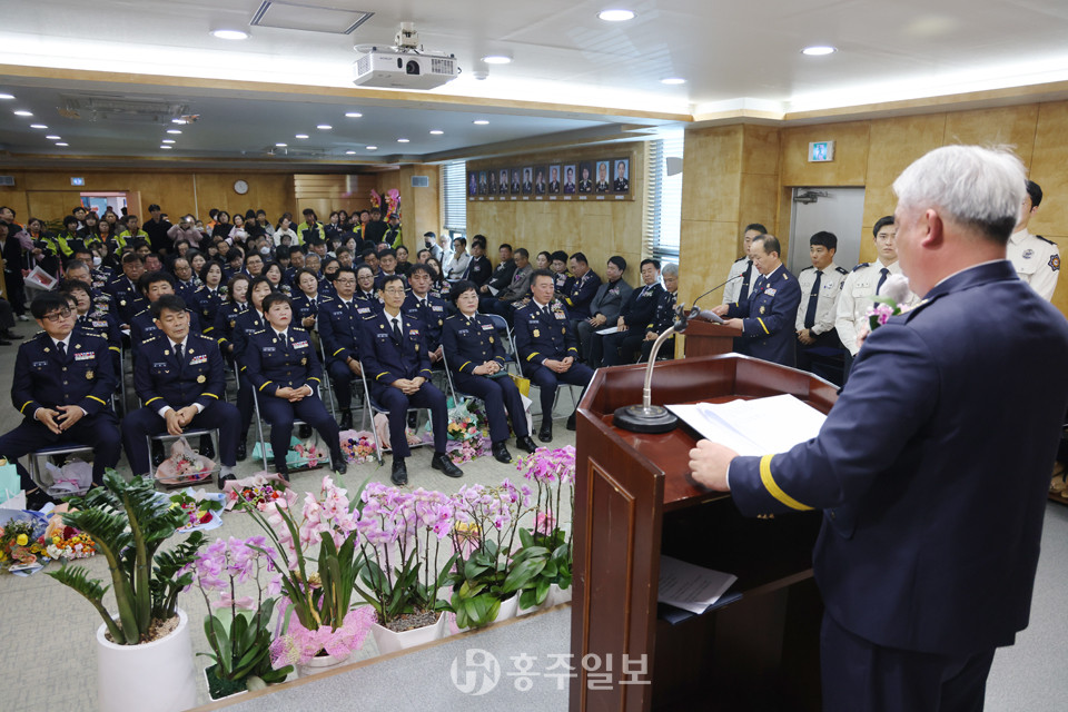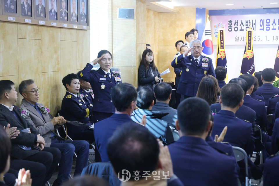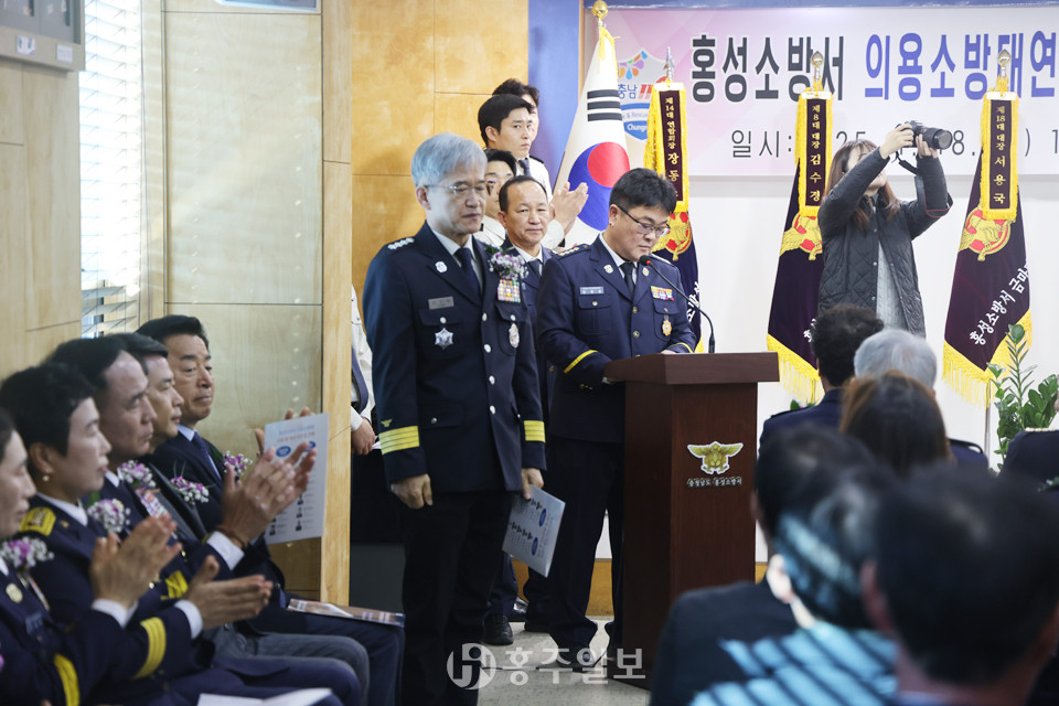 “지난 2023년 봄, 서부면 일대에서 발생한 대형산불로 인해 3일 동안 의용소방대원들은 생업을 뒤로 한 채 산불피해를 막기 위해 매달렸습니다. 오늘 이임하신 대장님들이 그때 그 현장에 함께 계셨습니다. 산불은 홍성에 큰 상처를 남긴 채 꺼졌고, 이 과정에서 우리의 마음에도 트라우마로 큰 상처가 남아 지금까지도 후유증에 시달리고 있습니다. 산불현장 속에서 함께했던 여러분의 헌신에 고개 숙여 감사드립니다.”