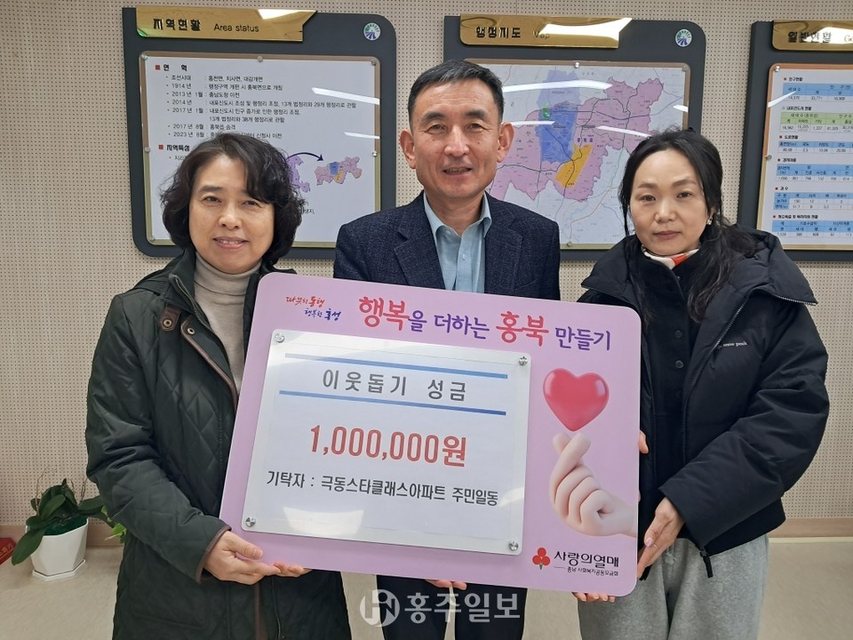홍북읍 소재 극동스타클래스아파트 주민들이 지역의 소외된 이웃들을 위해 성금 100만 원을 기탁했다.<사진>