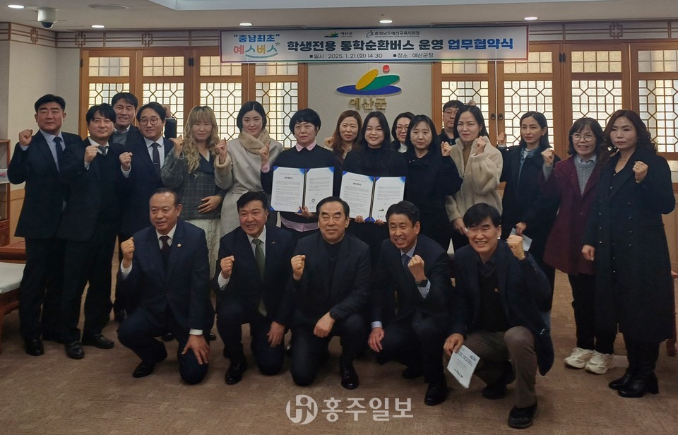 예산교육지원청(교육장 박동신)과 예산군은 지난 21일 충남 최초로 한정면허 제도를 활용해 내포신도시~예산을 운행하는 고등학생 전용 통학버스 운영 업무협약을 체결했다.<사진>