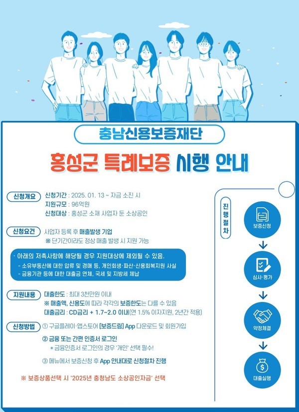 신청방법은 ‘보증드림’ 앱(어플)을 다운로드하고 회원가입 후 ‘2025년 충청남도 소상공인자금’을 선택해 진행하거나, 충남신용보증재단 내포지점을 통해 할 수 있으며 자금이 소진될 때까지 접수한다. 자세한 내용은 충남신용보증재단 내포지점(041-630-7302~6)으로 문의하면 된다.