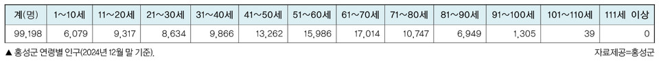 홍성군 전체 인구 9만 9198명(2024년 12월말 기준) 중에 가장 많은 수의 연령대는 61~70세로 1만 7014명인 것으로 나타났다. 그다음 많은 연령대는 51~60세로 1만 5986명, 그리고 41~50세가 1만 3262명으로 나타났다. 또한 71~80세는 1만 747명으로 나타났다. 홍성군 전체인구 중 65세 이상 인구는 2만 7077명으로 전체 인구의 27.3%이다.