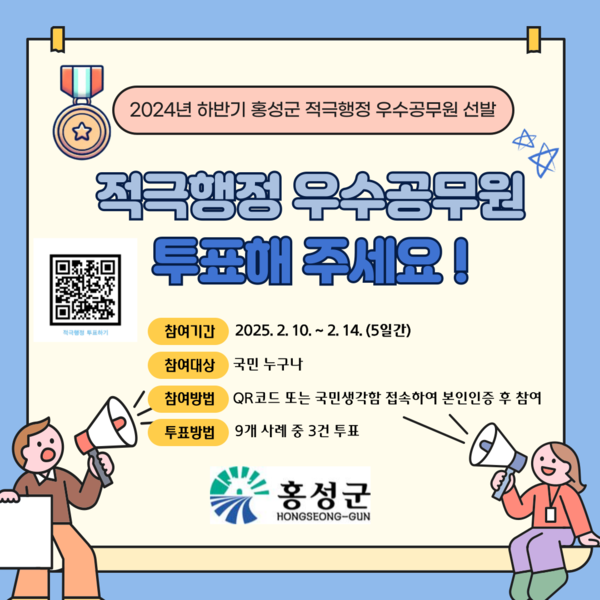 홍성군은 오는 14일까지 적극행정 우수공무원 선발을 위한 온라인 주민 투표를 국민권익위원회 국민생각함에서 진행한다.