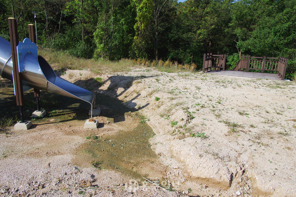 문제는 이 놀이터에서 어린이들이 놀기에는 위험해 보인다는 것이다. 놀이시설 하단 기둥의 콘크리트는 매립되지 않아 그대로 노출돼 있고, 여느 어린이 놀이터에서 볼 수 있는 우레탄 바닥같은 것이 아니라 돌멩이들이 섞여 있는 모래 바닥이다. 또한 공사를 하다가 만듯한 배수로까지 보인다.