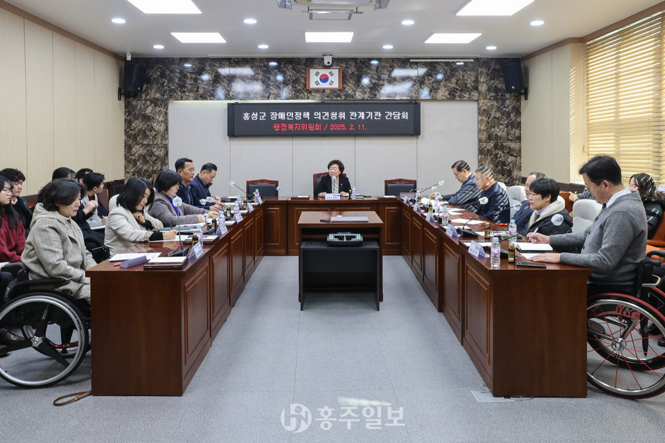 홍성군의회 행정복지위원회(위원장 윤일순)는 지난 11일 의회 소회의실에서 ‘홍성군 장애인 정책 의견 청취를 위한 관계기관 간담회’를 개최했다. 이번 간담회는 장애인 복지 관련 현안을 논의하고, 실효성 있는 정책 대안을 마련하기 위해 진행됐다.<사진>