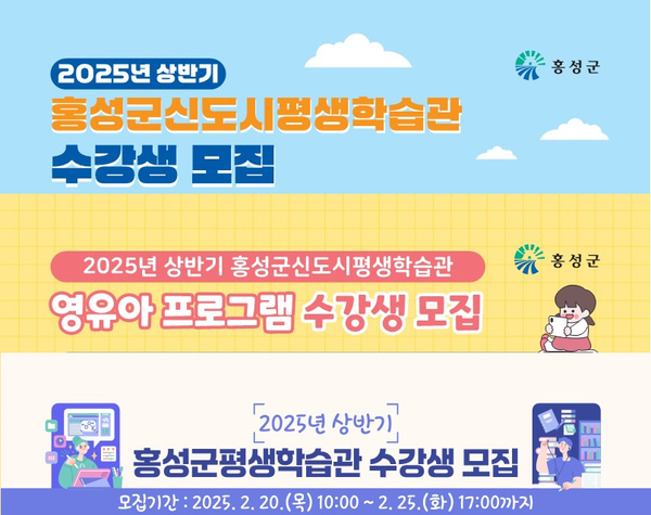 평생학습도시 홍성군은 오는 20일부터 25일까지 6일간, 전 생애를 아우르는 맞춤형 교육 기회를 제공하기 위해 홍성군평생학습관과 신도시평생학습관에서 2025년 상반기 프로그램 수강생을 모집한다.