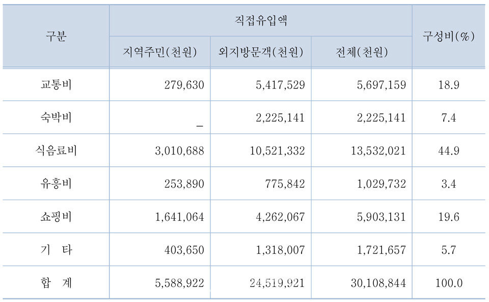 경제효과 금액은 외래 방문객의 총 지출액에 지역주민 방문객 총 지출액을 더한 것으로 산출했으며, 축제 방문객 수 55만 명(주최 측 추산) 중 지역주민은 23.4%(12만 8700명), 외지방문객은 76.6%(42만 1300명)을 반영해 나타난 결과다.