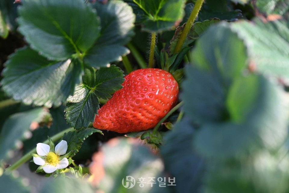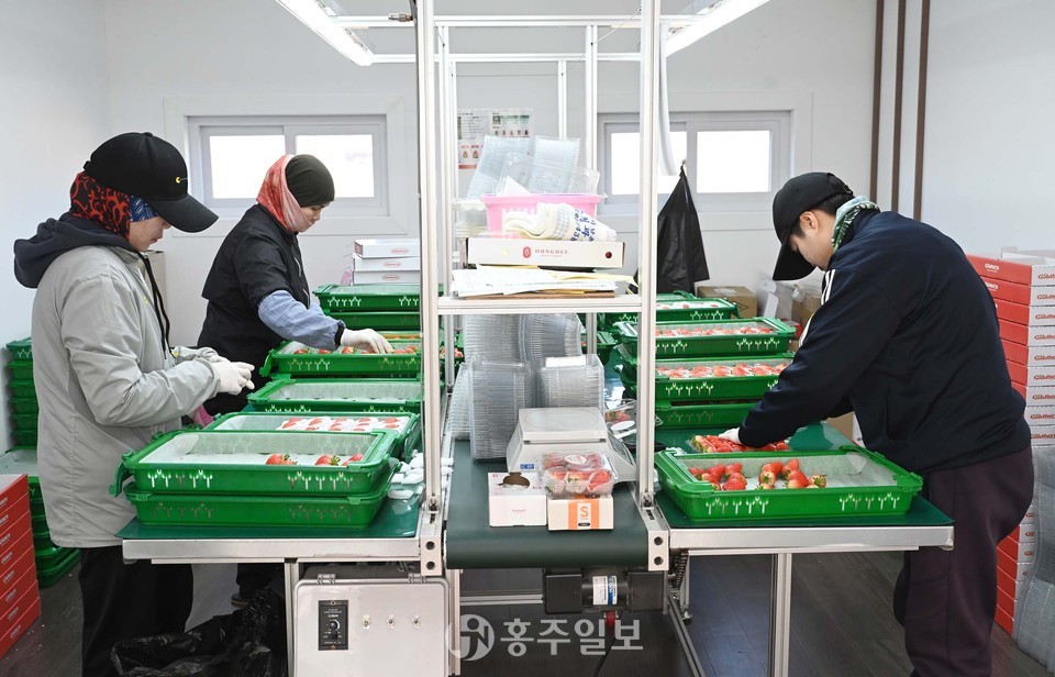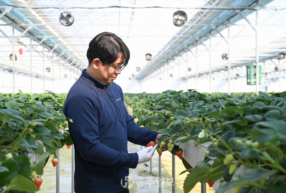 지난 18일 홍성군 갈산면의 한 스마트팜 농장 관계자가 골드 베리 딸기 발육 상태를 살펴보고 있다.<사진>