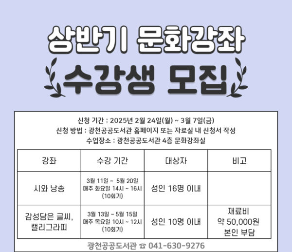 홍성군 광천도서관에서는 오는 3월 7일까지 상반기 문화강좌에 참여할 대상자를 모집한다.