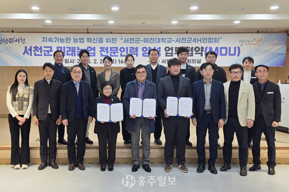 혜전대학교(총장 이혜숙)는 서천군·서천군4-H연합회와 지난 24일 서천군청에서 지속 가능한 농업 혁신을 위한 미래 농업 전문인력양성을 위해 업무협약을 체결했다.<사진>