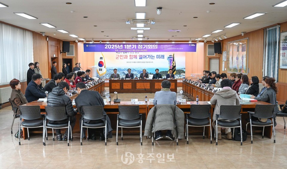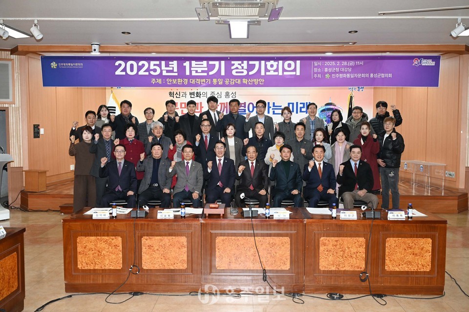 민주평화통일자문회의 홍성군협의회(협의회장 박만, 이하 ‘홍성군협의회’)는 28일 홍성군청 대강당에서 자문위원 32명이 참석한 가운데 ‘안보환경 대격변기 통일 공감대 확산방안’을 주제로 ‘2025년 1분기 정기회의’를 개최했다.<사진>