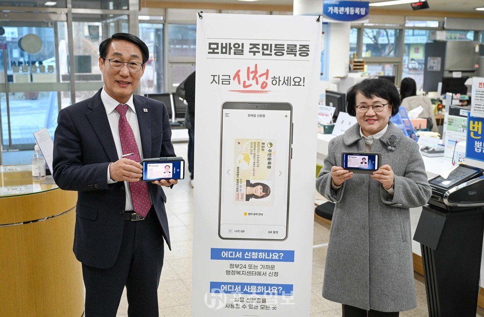 홍성군이 ‘모바일 주민등록증’ 발급을 새롭게 시작하며, 발급 첫날인 지난 28일 이용록 홍성군수와 조광희 부군수는 홍성읍행정복지센터를 방문해 나란히 ‘홍성군 제1호‧제2호 모바일 주민등록증’을 발급받았다.