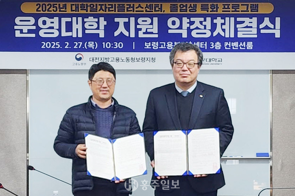 청운대학교(총장 정윤)는 지난달 27일 보령고용복지플러스센터(센터장 유병규)와 졸업생 및 졸업예정자들의 취업 역량 강화를 위한 업무협약을 체결했다.<사진>