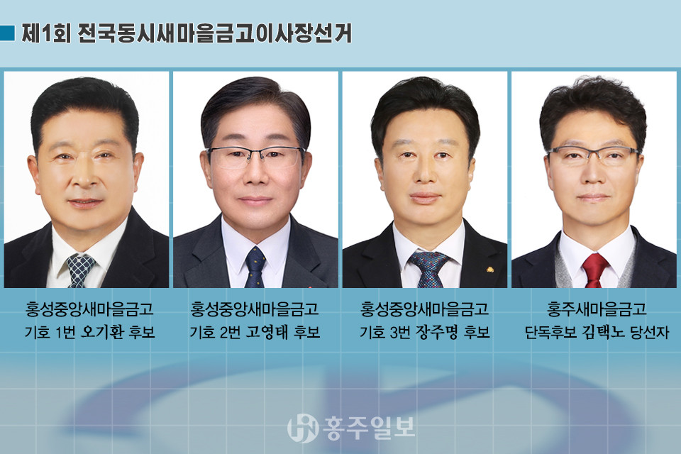 한편, 홍성군의 경우 홍성군에 본점 소재지를 둔 홍주새마을금고(직선제)와 홍성중앙새마을금고(간선제) 등 두 곳으로, 그중 홍주새마을금고는 단독 출마한 김택노 전 전무가 무투표 당선됐으며, 홍성중앙새마을금고는 △기호1번 오기환 후보 △기호2번 고영대 후보 △기호3번 장주명 후보 등 3명의 후보가 선거에 나서며 대의원 투표를 통해 이사장을 선출할 예정이다.