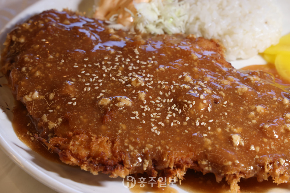 돈가스는 고기 망치에 두들겨진 돼지고기가 밀가루-달걀물-빵가루 순으로 옷을 입고 기름에 튀겨지게 되는 것이 보통인데, 본가두부전문점의 돈가스는 밀가루와 달걀물이 과감히 생략된 자리에 특별 비법인 ‘무엇’으로 고기를 적신 뒤 젖은 빵가루를 입혀 튀긴다는 것이다.