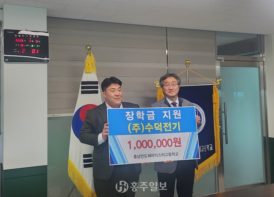 충남반도체마이스터고등학교(교장 이종한)는 지난 6일 교장실에서 본교 졸업생이자 지역업체인 수덕전기(대표 김진성)로부터 학교발전기금을 전달받았다.<사진>