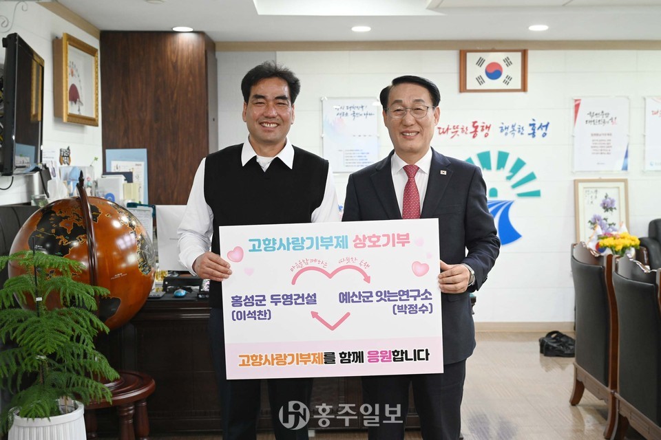 홍성군과 예산군이 지난 7일 홍성군의 ‘두영건설’과 예산군의 ‘잇는 연구소’ 두 업체 간의 고향사랑 기부금 전달로 이웃 지자체 간 상호기부의 시작을 알렸다.<사진>