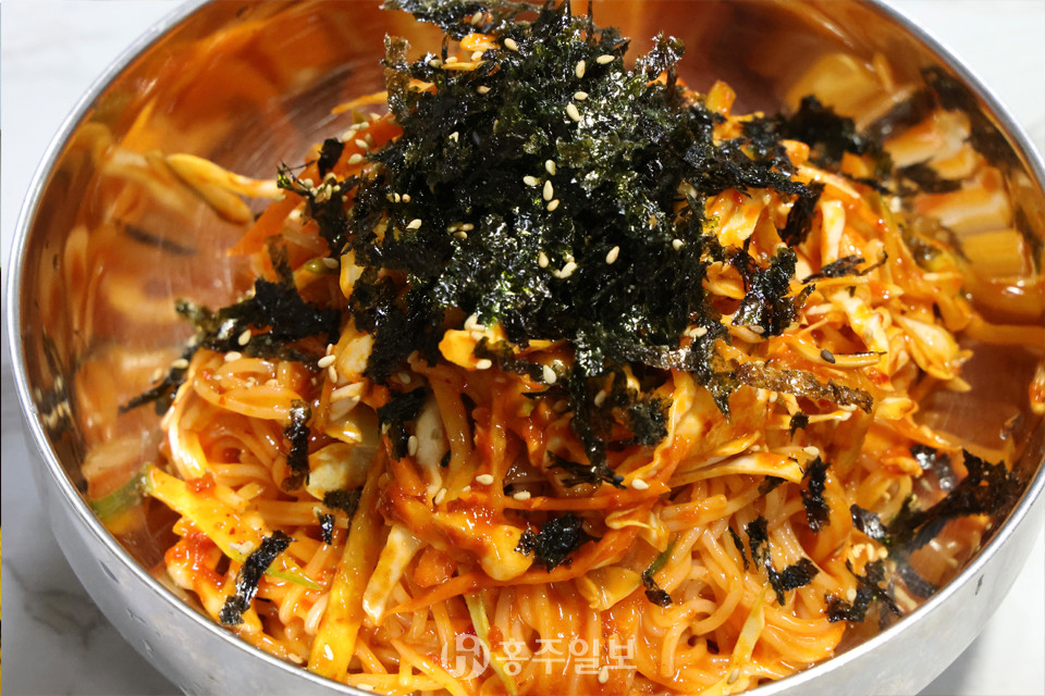 잔치국수에 홀려 기자와 동행한 이가 맛본 비빔국수에 대한 설명을 빠트릴 뻔했다. 비빔국수는 숙성된 고추장 양념에 양배추, 오이, 당근, 김 가루, 깨가 버무려진다. 비빔국수용 고추장 양념에는 매실과 사과, 양파 등이 들어가며 앞서 김 대표가 말했듯 1주일간 숙성을 거친 뒤 사용된다. 잔치국수를 먹다 한 입 뺏어 먹어본 비빔국수는, 고작 한 입이었기에 정확하게 맛을 표현하는 데 무리가 있겠지만, 한 편으로는 잔치국수와 대조되는 맛이기에 오히려 더 정확할 수도 있을 거라 생각된다. 본론으로 돌아가, 비빔국수는 그 무엇도 두드러지지 않는 유연한 맛이었다. 보통 쫄면이나 비빔국수류는 새콤달콤한 맛에 매콤함이 더해지게 되는데, 그중 무엇도 확 튀지 않는, 서로가 어깨동무를 하고 있는 듯한 맛이었다.