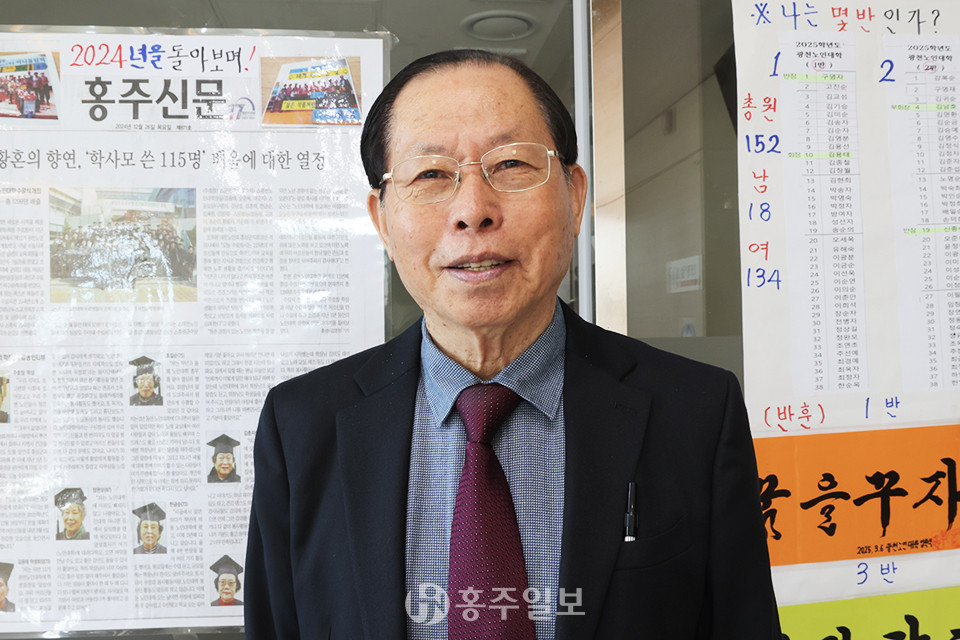 “2019년부터 시작해 오늘날까지 6년간 학장으로서 많은 어르신들을 만나 뵙고 가르치며 저 또한 참 많은 것을 배우고 있습니다. 지난해 홍주신문에서 저희 광천노인대학 수료식 때 인터뷰를 했었죠. 그리고 저희 쪽에서는 어르신들에게 ‘내가 살아온 길’에 대한 글을 쓰도록 했습니다. 그중 몇 개의 글을 선정해 반장들이 낭독을 했는데 정말 눈물겨운 사연들이 많았습니다. 시대를 잘못 만난 탓에 이루지 못했던 배움에 대한 갈망을 뒤늦게라도 노인대학을 통해 이루고 계신 어르신들을 보면서 매번 보람을 느끼게 됩니다. 많은 분들께서 ‘노인대학 오는 날을 손꼽아 기다리신다’고 말씀하십니다. 노인대학이 계속해 이어질 수 있는 것은 군의 재정적 지원과 배움에 대한 열정을 가진 어르신들 그리고 대한노인회 홍성군지회까지, 모두의 합심 덕분입니다. 노인대학에 발걸음하시는 모든 어르신들이 공부하면서 감동받고 감격하고 지혜를 나누고 얻어 가시길 바랍니다.”