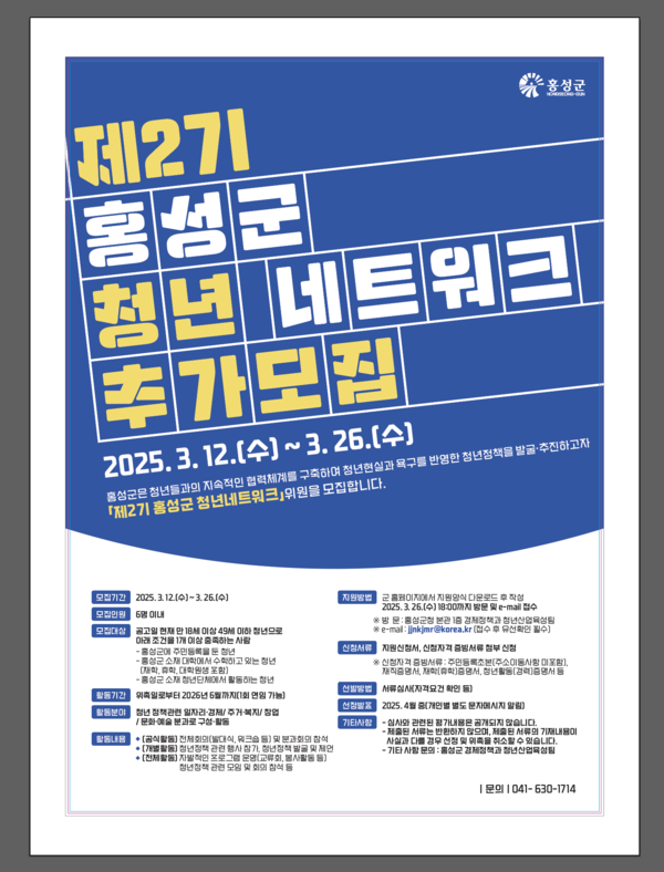 군은 지난해 6월 위촉된 제2기 청년 네트워크 위원의 잔여임기(2026년 6월)까지 활동할 수 있는 위원을 추가모집 한다는 계획이다. 모집인원은 6명 이내이며, 홍성군에서 거주하거나 활동하는 18세 이상 49세 이하 청년이면 누구나 신청 가능하다. 신청 서류는 홍성군청 누리집 공고란을 참고해 홍성군 경제정책과로 방문 또는 전자우편으로 접수하면 된다.