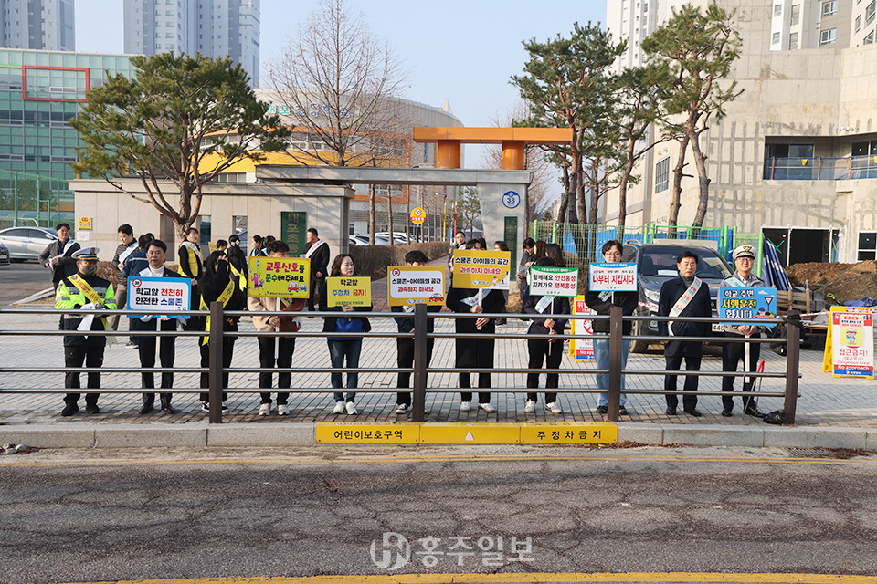 캠페인 참여자들은 내포초등학교 정문 앞 횡단보도에서 △선다! 살핀다! 건넌다! △아이 먼저 보내주세요 △교통법규 준수 생활화 △걸어갈 때 휴대폰을 보지 않아요 등의 문구가 적힌 어깨띠와 피켓을 들고 올바른 등굣길 안전수칙에 대한 교통지도를 실시했다.