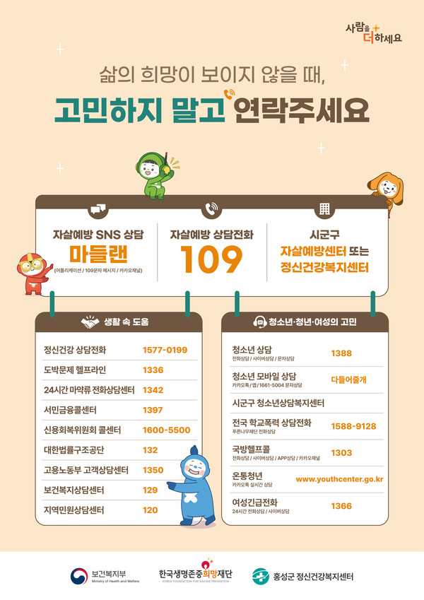 한편 홍성군보건소는 오는 23일까지 생명사랑 집중 홍보 주간을 지정해 지역 내 보건지소·진료소에 자살예방 상담전화 현수막 게시, 11개 읍·면 전광판, 인터넷, SNS 등의 다양한 온·오프라인 매체를 활용해 지역주민들에게 생명의 소중함을 인식시키기 위한 홍보활동도 함께 진행한다.