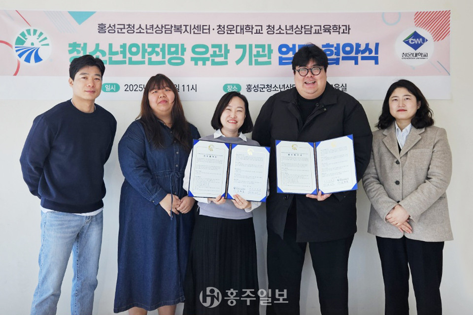 홍성군청소년상담복지센터(센터장 조현정)는 지난 19일 청운대학교 청소년상담교육학과(학과장 박지수)와 업무협약(MOU)을 체결하고, 청소년 안전망 강화를 위한 협력을 약속했다.<사진>