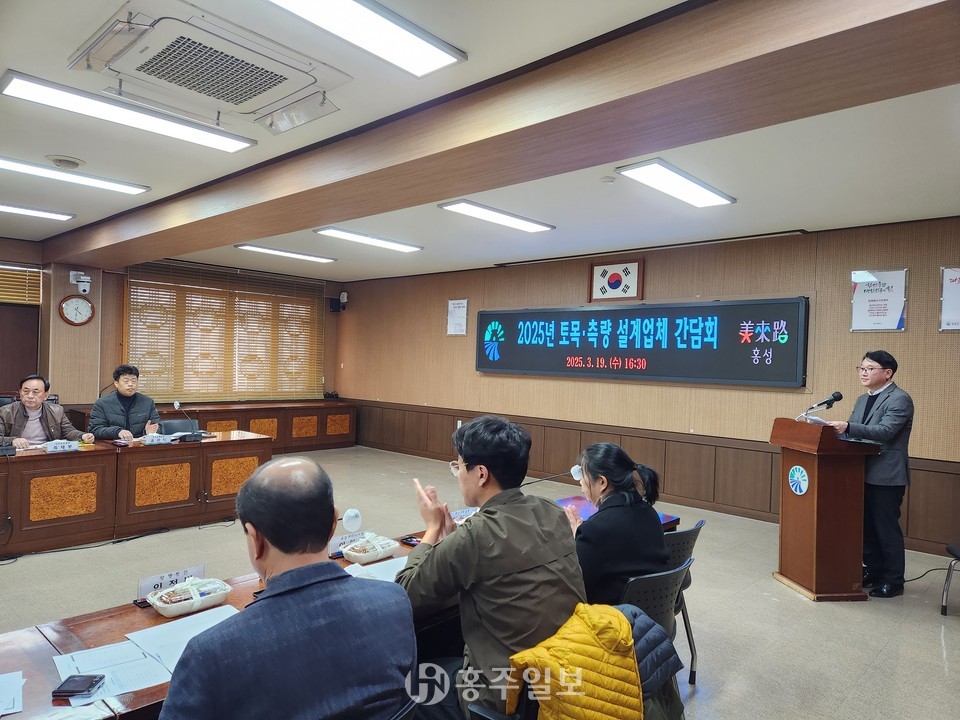 홍성군은 지난 19일 군청 회의실에서 지역 내 토목·측량 설계업체를 대상으로 소통 간담회를 개최했다.<사진>